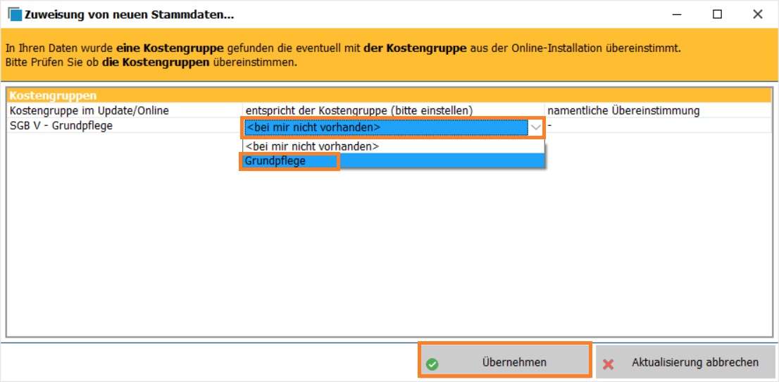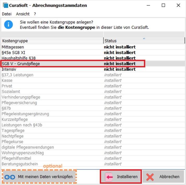 3. Wähle die gewünschte Kostengruppe aus und installiere sie (z. B. SGB V – Grundpflege).
