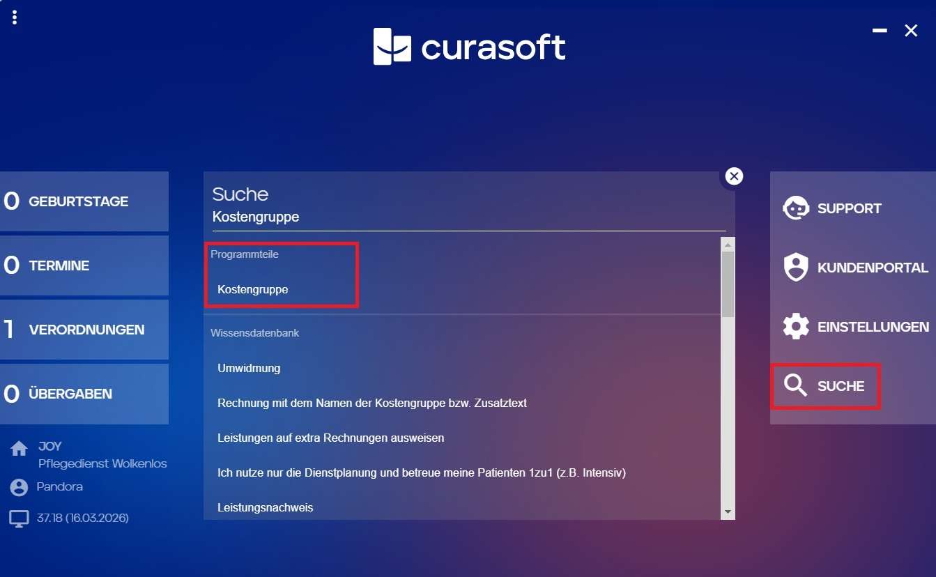 1. Öffne die Startmaske und gib „Kostengruppe" in die Suche ein.