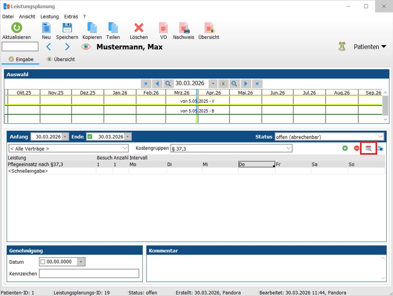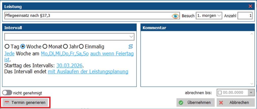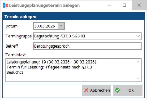 Wenn du die Leistungsplanung für einen Beratungsbesuch anlegt, kannst dort auch direkt einen Termin im Terminkalender des Patienten hinterlegen.