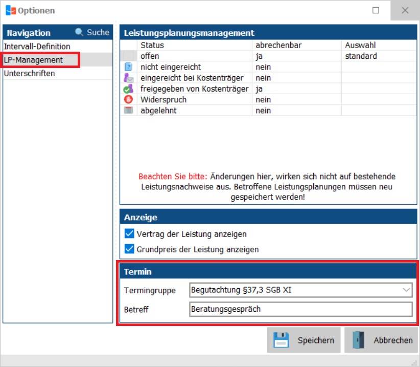 In den Optionen der Leistungsplanung kannst du einstellen, welche Termingruppe und welcher Betreff als Standard angezeigt werden sollen.
