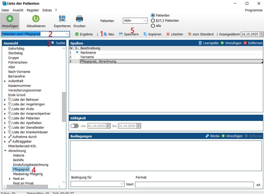 (2) Hier kannst du Bedingungen für die Liste festlegen, zum Beispiel: Zeige mir nur Patienten mit einem Pflegegrad höher als 0 oder alle Patienten, die vor dem Datum X bei uns im Pflegedienst aktiv waren, und so weiter.